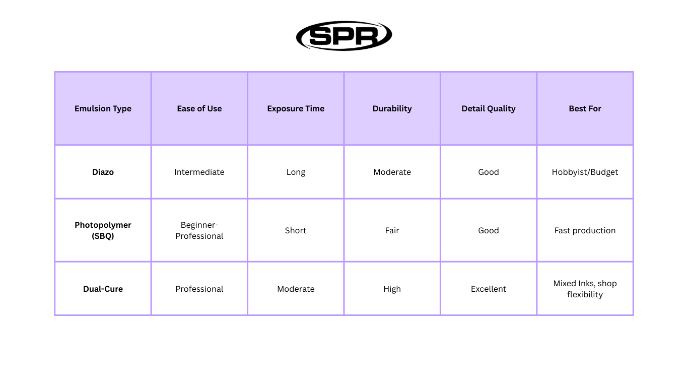 Diazoemulsions are great for beginners and hobbyists. Diazo emulsions are typically inexpensive, forgiving on exposure time, and generally easier to work with. They need to be mixed with a diazo sensitizer (typically a powder) to be used. Once mixed, diazo emulsions are built to last one to two months on the shelf. As the least expensive kind of emulsion, diazo unfortunately does have a harder time with more intricate designs. Therefore, we recommend it for simpler jobs & smaller workloads.