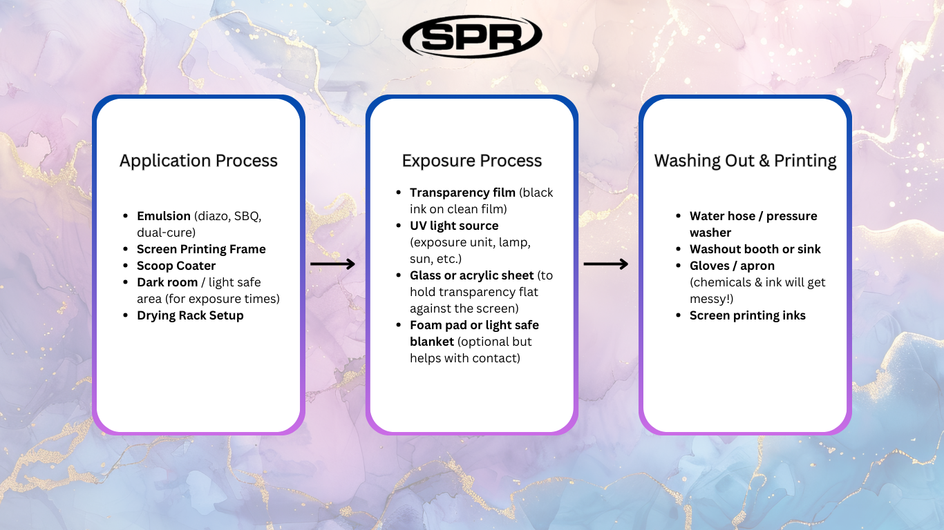 An important thing to note, removing the emulsion and resetting the screen is a process known as reclaiming, where you use specific removal agent to clean up the screen. It has its own process, and for the sake of length (we've gone through a lot) we feel it would be better with its own post.